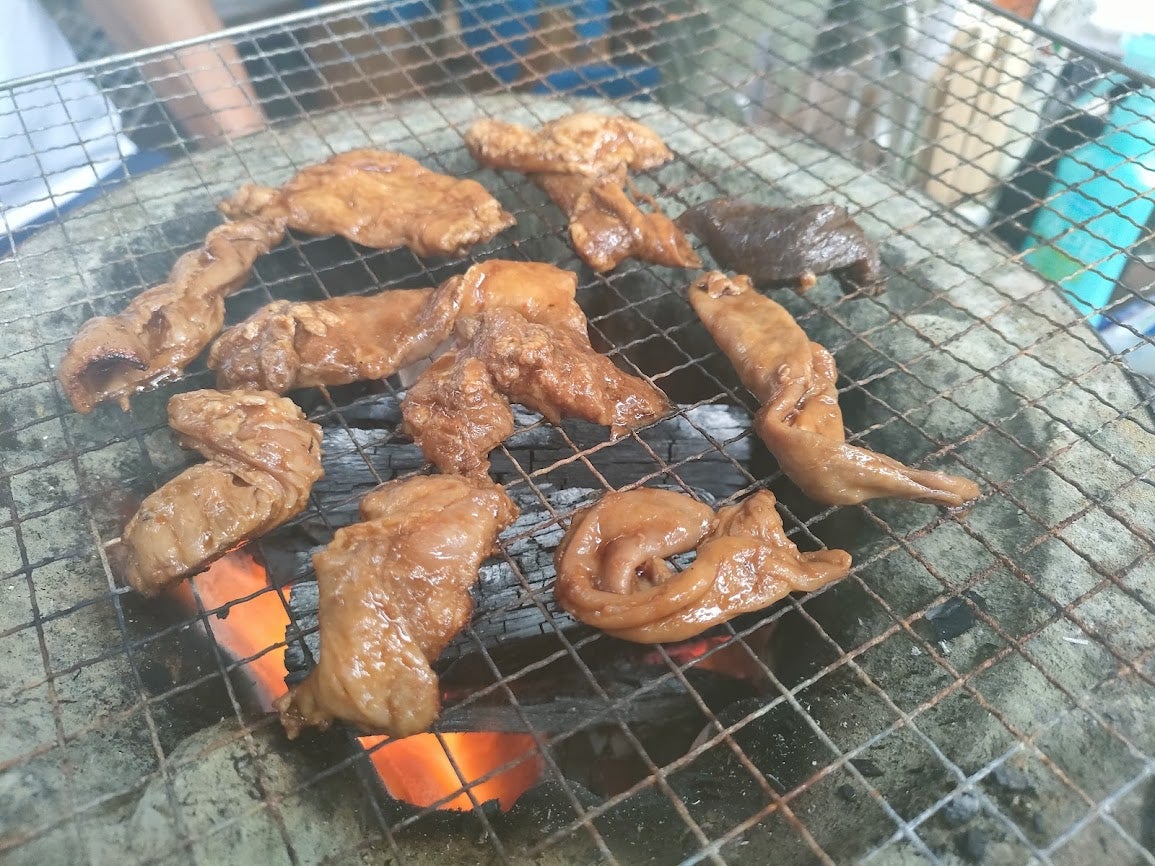 味噌ダレホルモンをほぼ焦げてるくらいまで焼いて食べる。